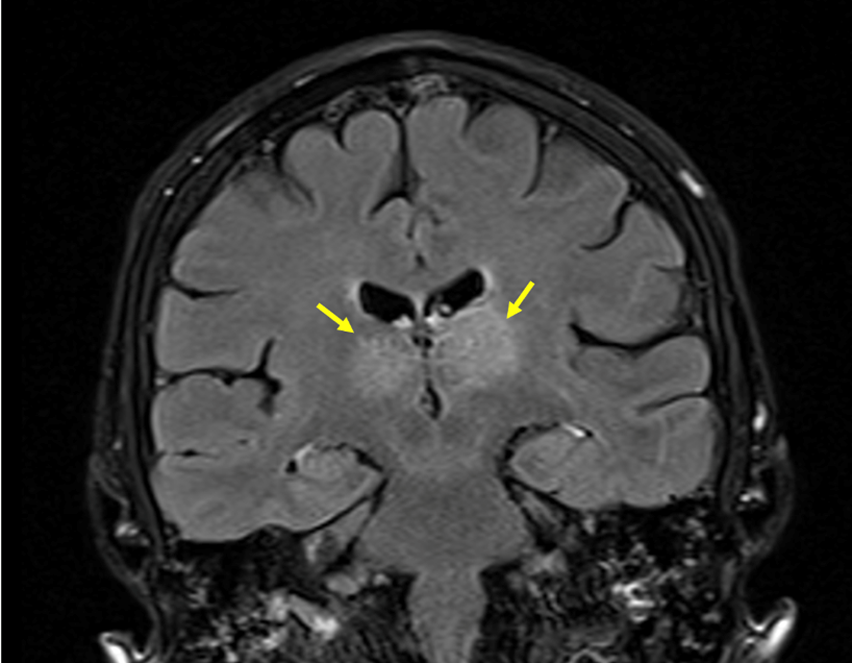 Fig. 2 MRI FLAIR sequence showing bilateral thalamic hyperintensity related to parenchymal infarcts (yellow arrows, coronal view).