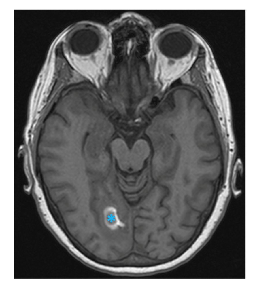 Fig. 3 MRI T1-weighted image showing signal disturbance in the right occipital lobe with hyperintense peripheral halo, corresponding to hemorrhagic infarct (blue asterisk, axial view).