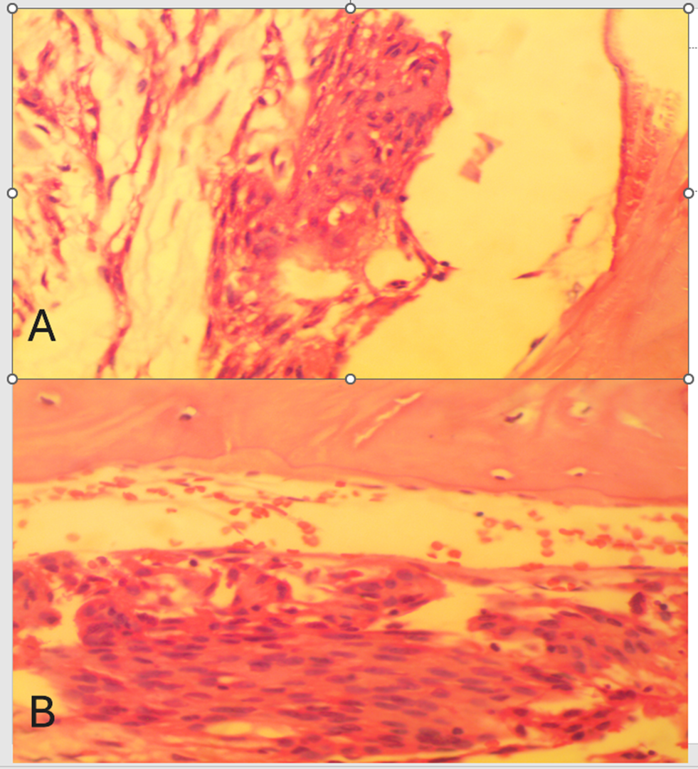 Results: Out of the 377 cases examined, 228 were classified as grade 1 (60%), 134 as grade 2 (36%), and 15 as grade 3 (4%). Bone invasion was noted in less than 0.01% of grade 1 tumors (1 case), 22% of grade 2 tumors (30 cases) (Figure A), and 73% of grade 3 tumors (11 cases) (Figure B).