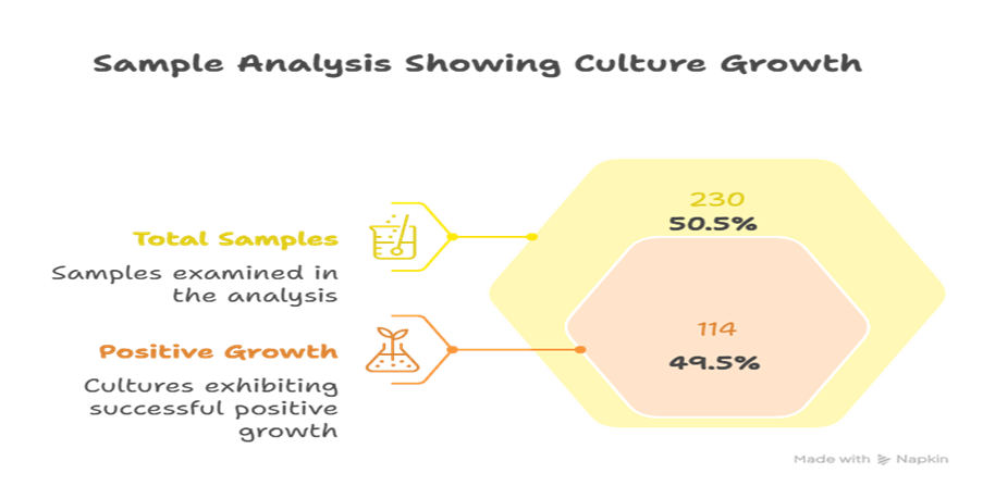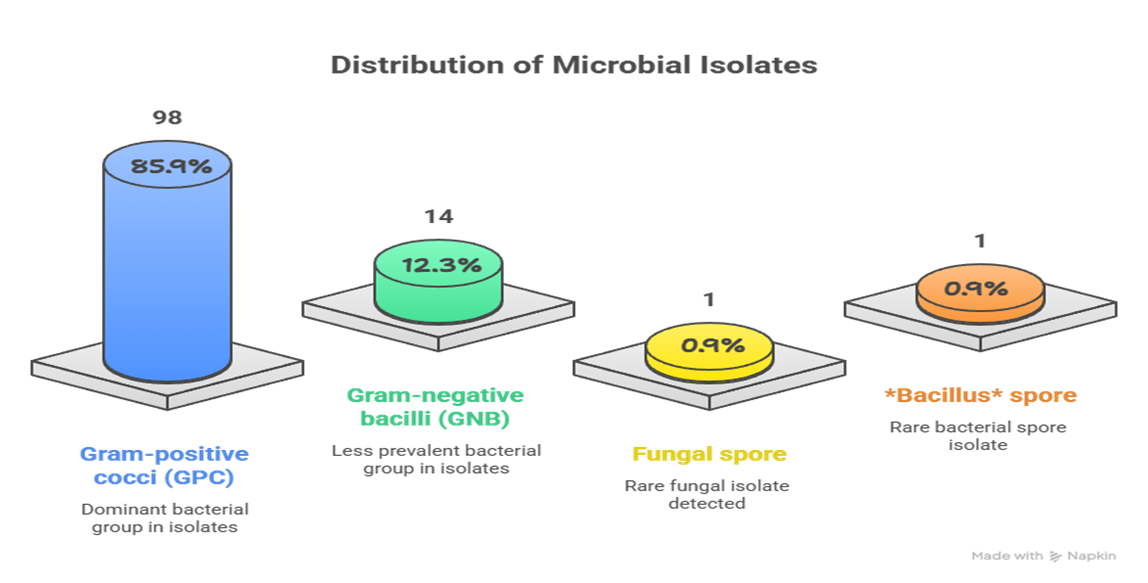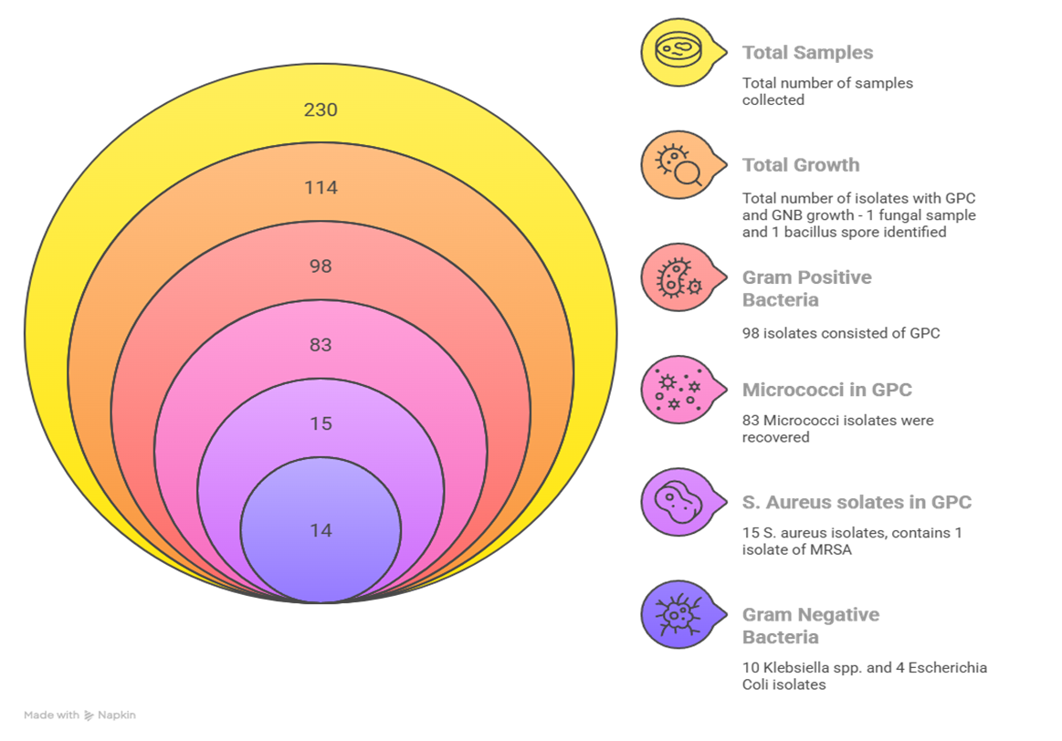 Results: Microbial growth was observed in 114 of the 230 samples (49.6% of the total samples). Among these, 98 samples (85.9%) were Gram Positive Cocci and 14 samples (12.3%) were Gran Negative Bacteriae. Gram Positive Isolates included 83 Micrococcus species. and 15 Staphylococcus aureus samples, of which 1 was an MRSA sample. GNB isolates comprised of 10 Klebsiella species. and 4 E. coli, with no resistance detected. One fungal spore and one Bacillus spore were also identified.