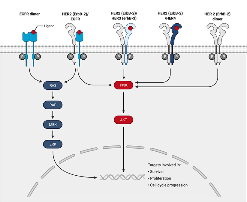 The input layer is composed of 4 membrane receptors/kinases (HER1–4) and their many ligands, including endothelin growth factor (EGF), transforming growth factor alpha (TGF-α), and heregulin. However, in breast cancer, HER2 is the dominant kinase receptor, overexpressed in 20% of cases (6). Upon ligand binding, the HER receptors undergo conformational changes that enable homo- or heterodimerization, followed by transphosphorylation of the receptors. HER2 does not have ligand- binding capabilities, but its open conformation allows for dimerization. When overexpressed, the activated form heterodimerizes with other HER members that have ligand-binding capabilities or undergoes homo-dimerization (1). This dimerization leads to the activation of the PI3K/AKT anti- apoptosis pathway (Figure 1), thereby stimulating the activation of transcription factors and exhibiting a proliferative, migratory, angiogenic, and differentiation cancer phenotypes. The estrogen receptor (ER) and the HER2 signaling pathways are the dominant drivers of cell proliferation and survival in most (85%) breast cancers (1).