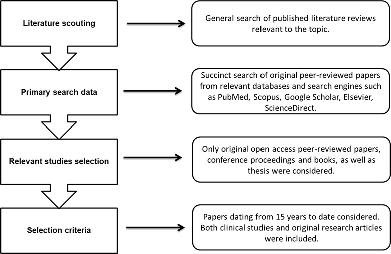 We conducted comprehensive literature review; 1) To gain a better understanding on the topic, by identifying recent literature reviews on the aforementioned, followed by selection of relevant original papers, 2) The search strategy and selection criteria to narrow down the search, 3) Appropriate methods for selecting relevant and up-to-date papers were undertaken; such include, but are not limited to the search language, prominent authors, papers with more citations, as well as credible peer-reviewed journals with higher impact factors, 4) The search was not limited to peer-reviewed papers and books, but extended to published conference proceedings and thesis. Below, in Figure 2 is a graphical depiction of the review strategy and workflow.
