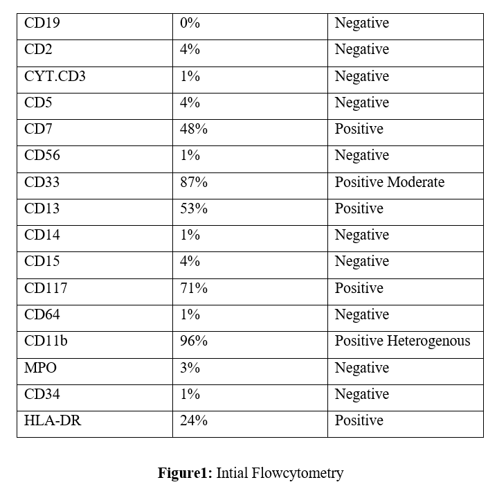 Flow Cytometry (Nov 2024): Immunophenotype consistent with Acute Basophilic Leukemia (CD33+, CD13+, CD117+, CD11b+, HLA-DR+).