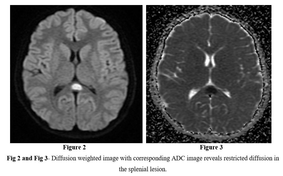 The syndrome is characterised by cytotoxic lesions in the splenium of the corpus callosum, manifesting as areas of low diffusion on diffusion weighted MRI images and low ADC values [12]. These lesions lack post-contrast enhancement and tend to be situated in the midline. Three patterns of involvement of the corpus callosum have been described: (a) round to oval lesion in the centre of splenium (b) Lesion centred in the splenium with extension through the callosal fibres into the adjacent white matter (c) a posteriorly centred lesion with extension into the anterior corpus callosum [13, 14].