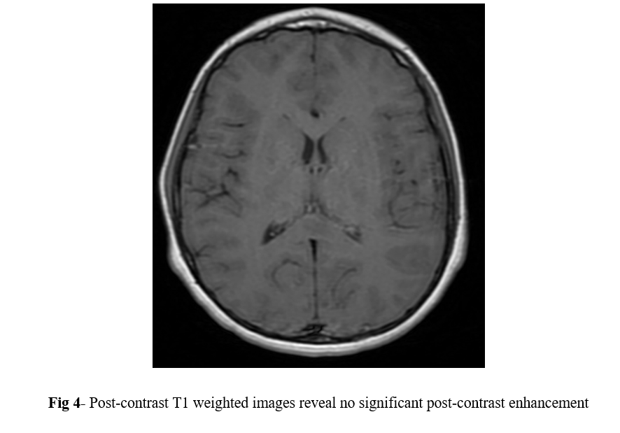 MRI follow-up at 3 months revealed complete resolution of the lesion. No evidence of restricted diffusion or abnormal post-contrast enhancement was observed on the follow-up scan (Figure 5). Evaluation of rest of the brain was unremarkable. The patient was no longer symptomatic for headache or staring episodes.